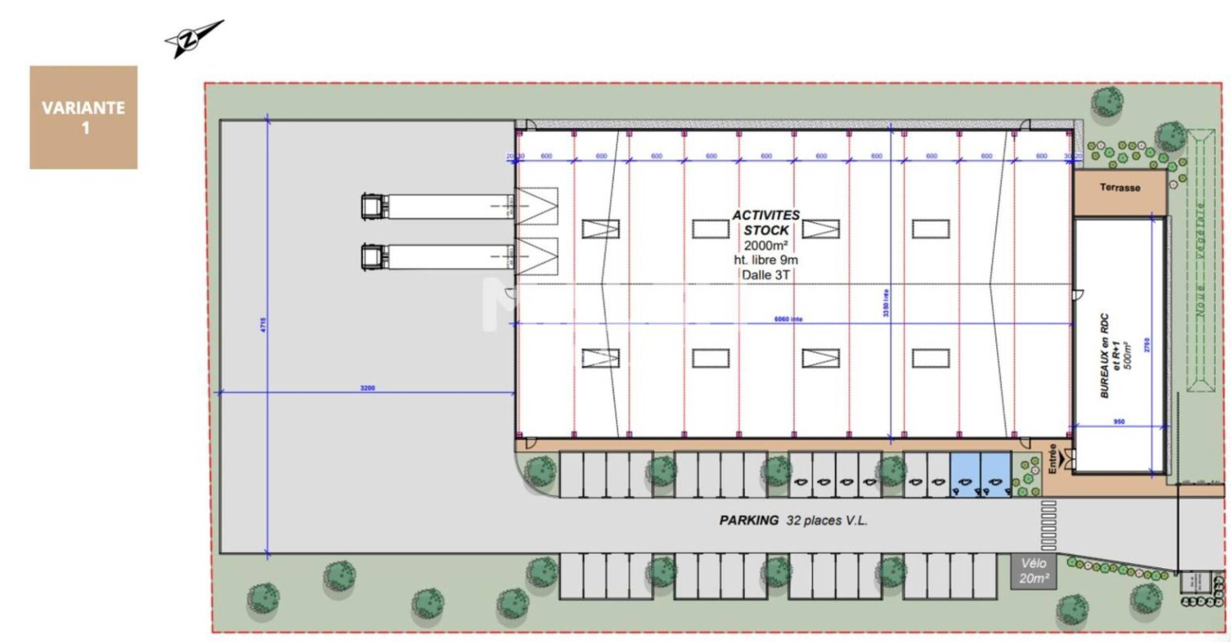 - Variante n° 1 : Bâtiment d'activités indépendant de 2500 m² dont 500 m² de bureaux sur son terrain avec 32 parkings