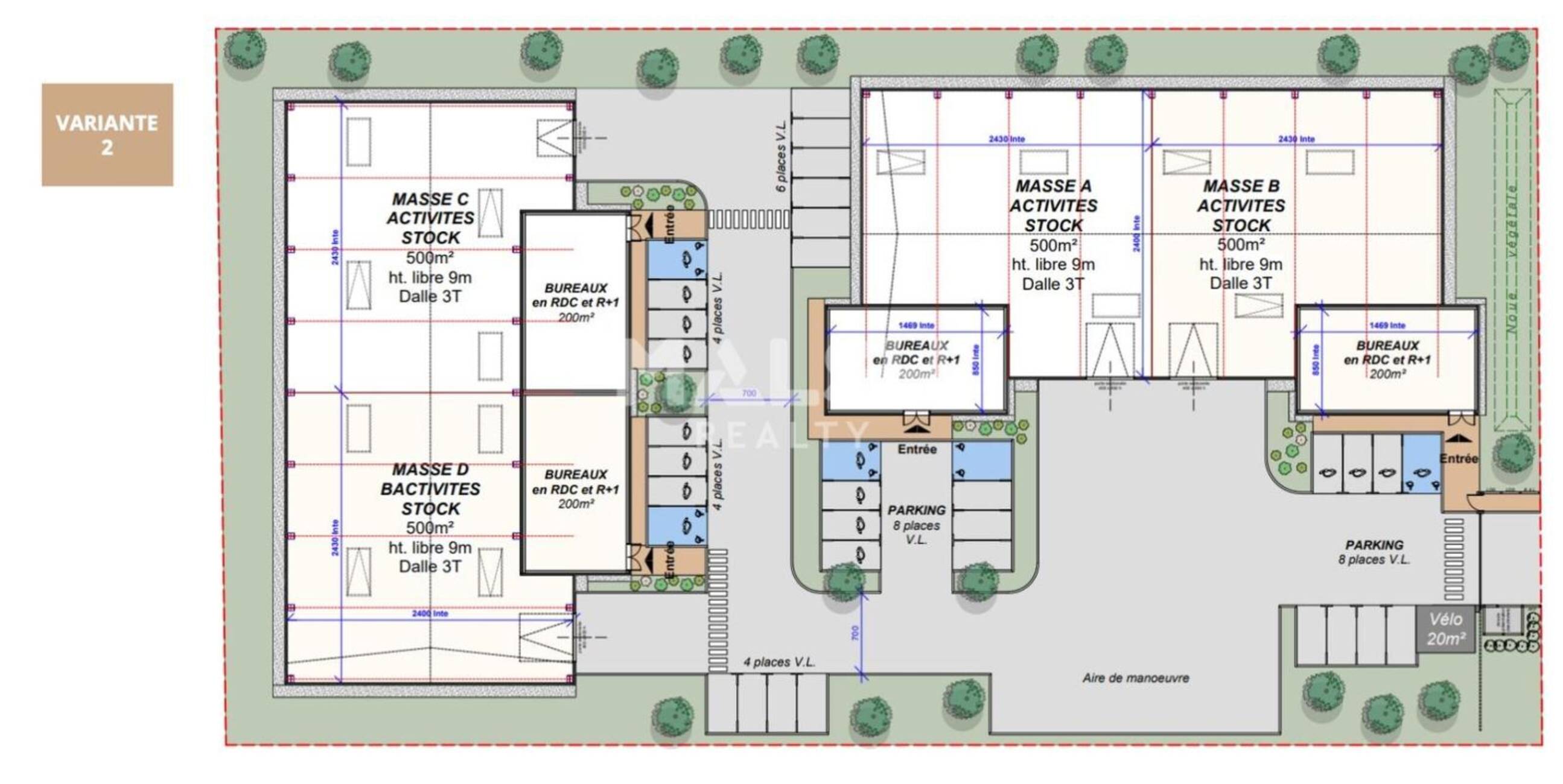 MALSH Realty vous propose à la vente sur un terrain clos de 6 637 m², des locaux d'activités neufs. 2 variantes possibles :