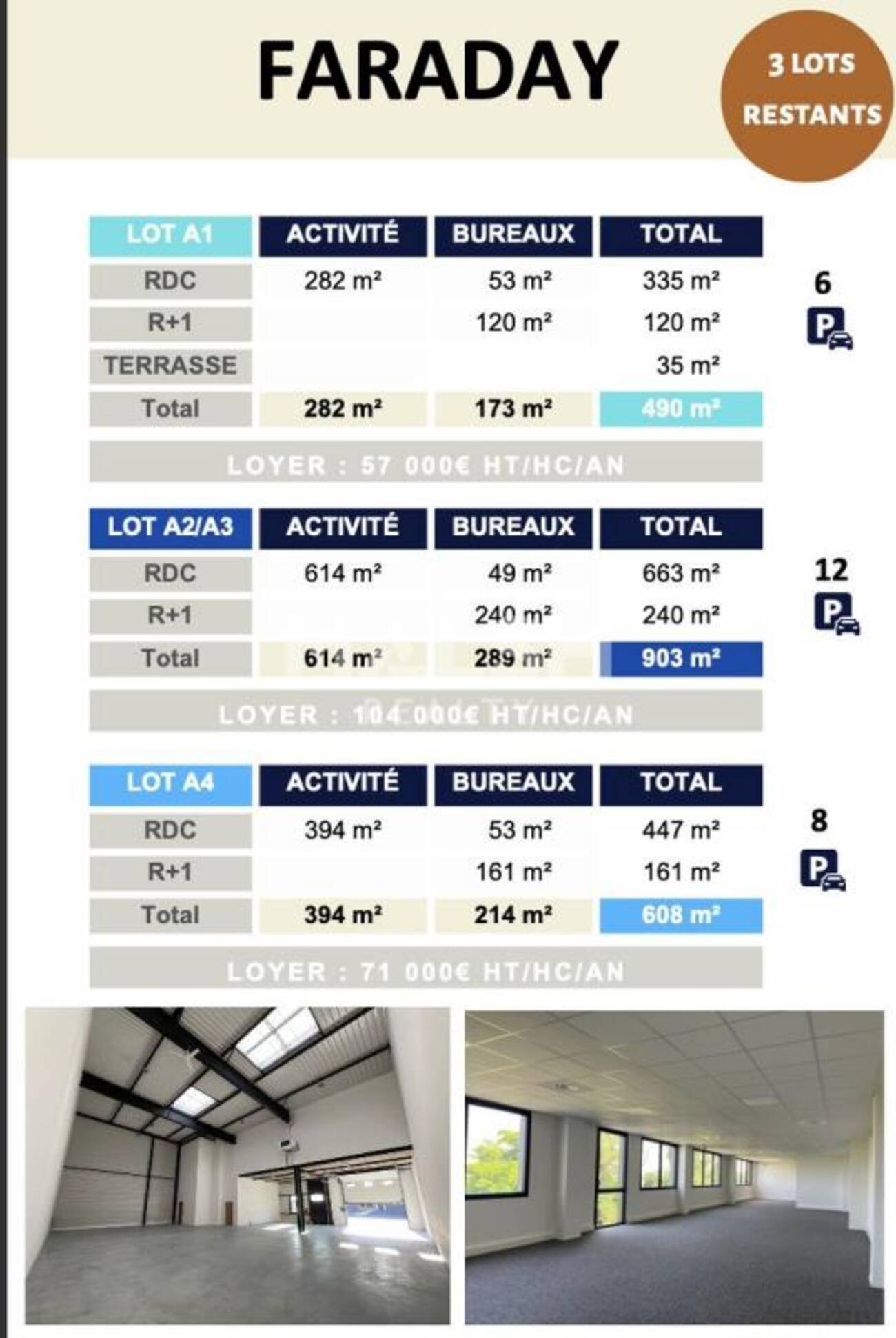 | Total Cellule A2-A3 | Activités | 903 | Immédiate | 115,17 HT/HC/m²/an | 15 % HT d'un an de loyer HT à la charge du preneur, payables à la signature du bail | T.V.A. (20%) | commercial 6/9/12 ans | ILAT Indice des Loyers des Activités Tertiaires | Trimestriel d'avance | A2-A3 | ||||||||