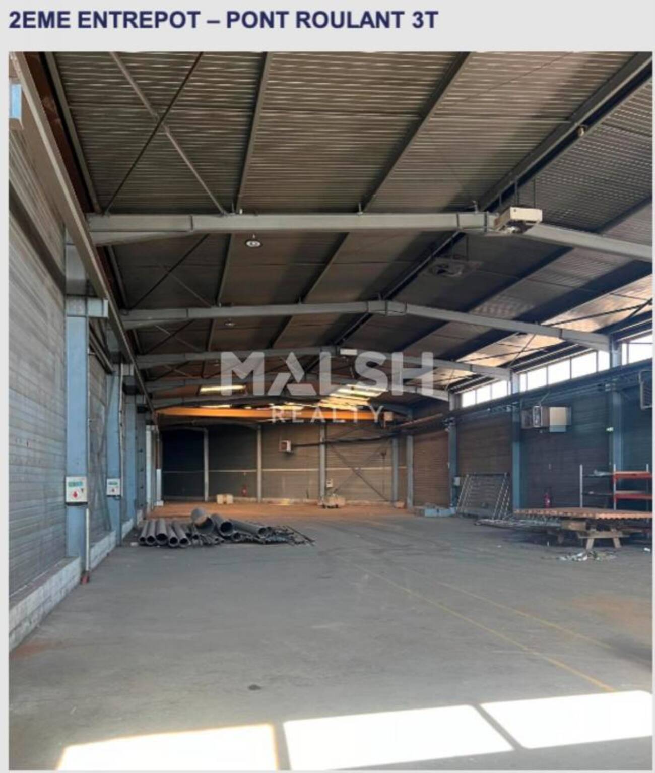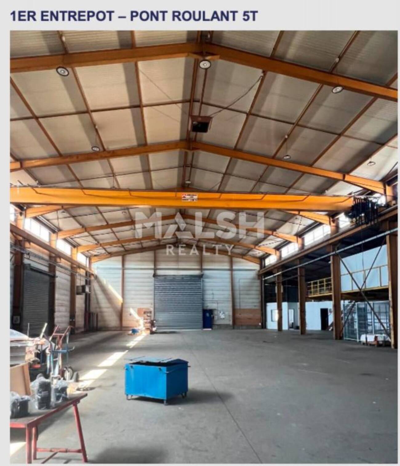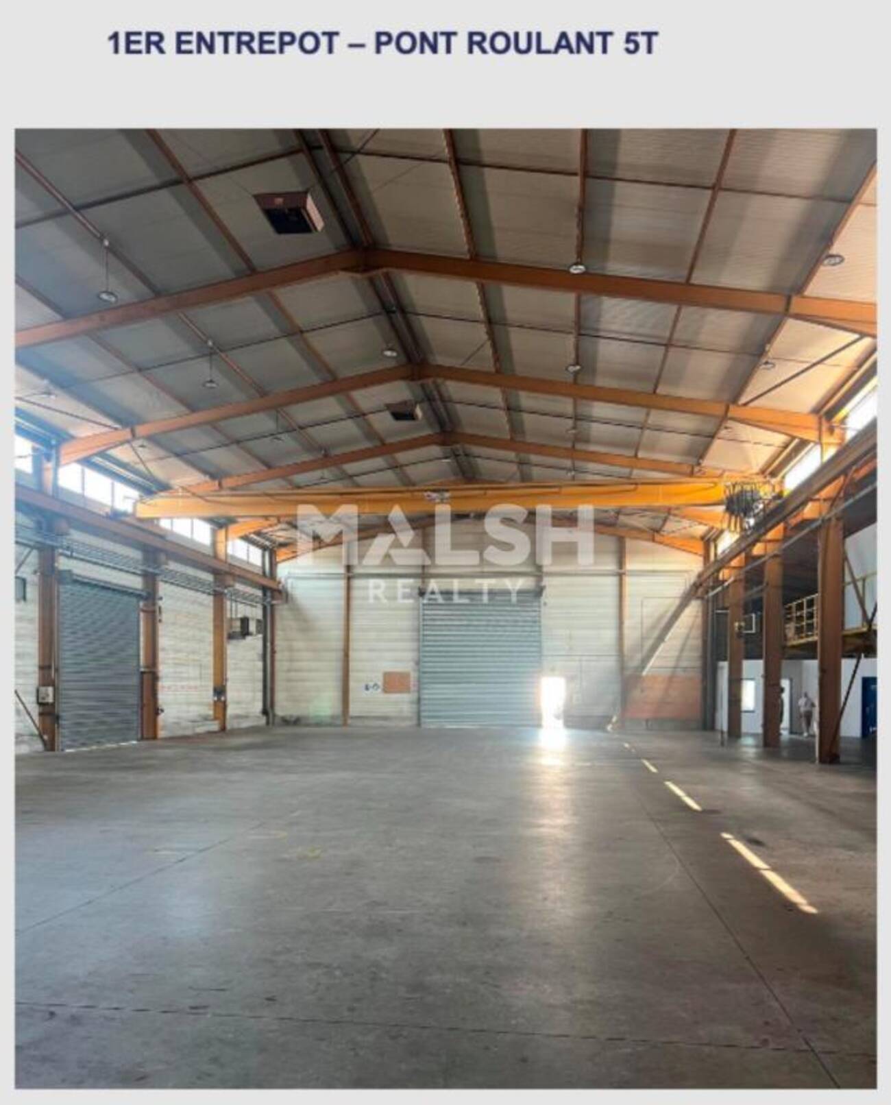 - Entrepôt 1 d'environ 1080 m² équipé d'un pont roulant de 5T, de trois rideaux métalliques automatisés, d'une mezzanine ainsi que des vestiaires et d'un bureau de quais