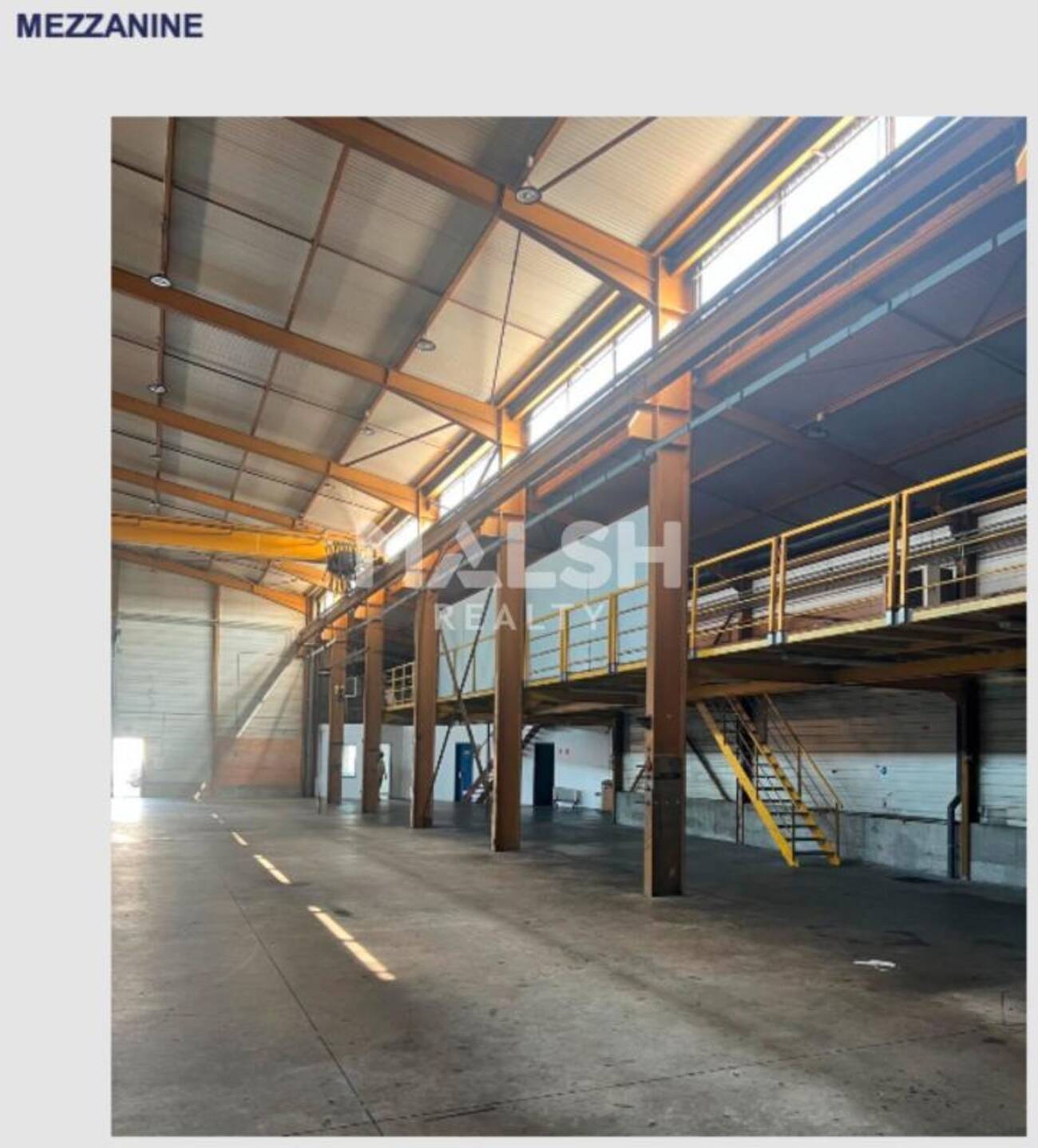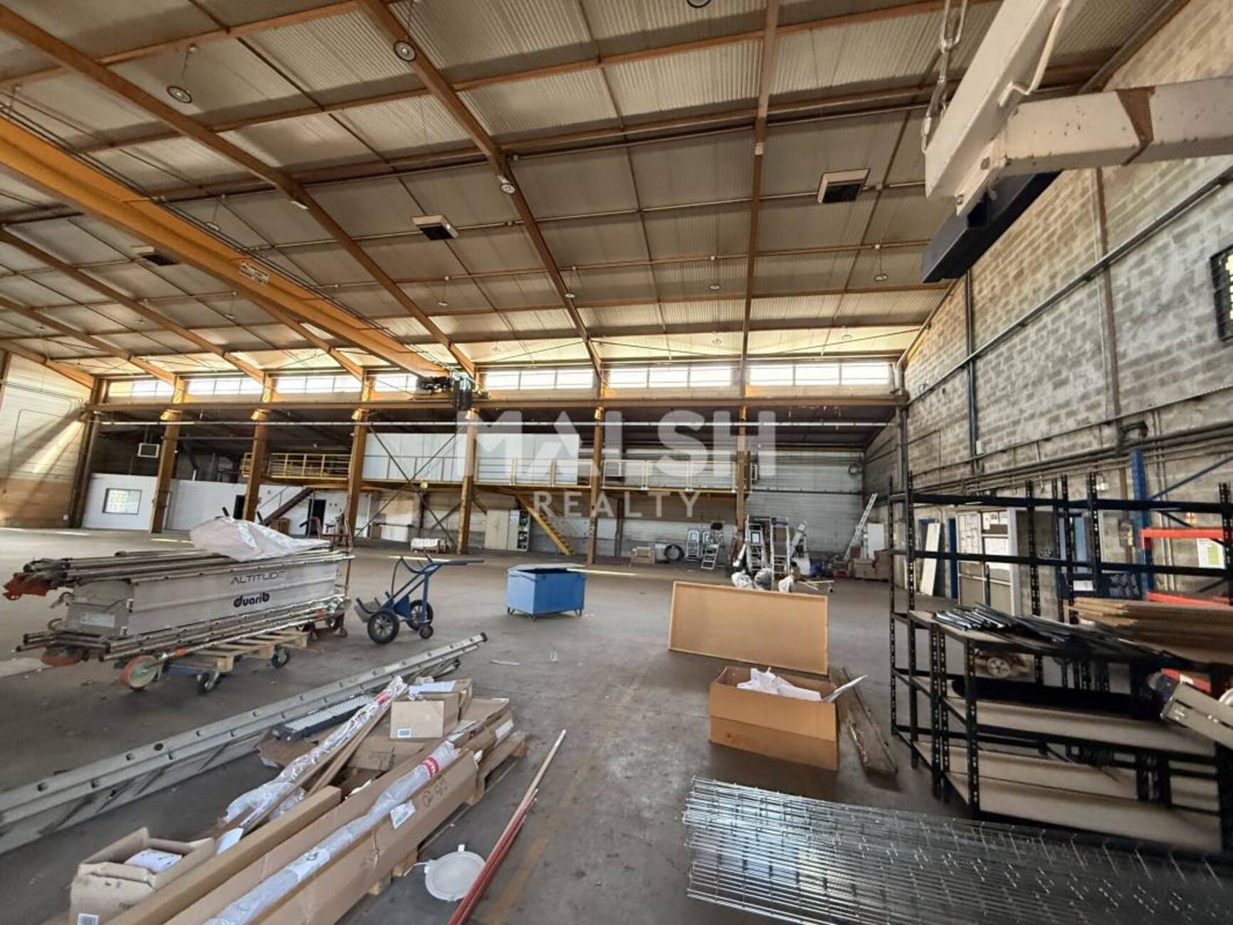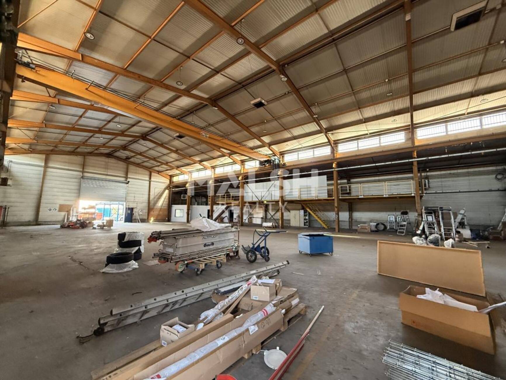 - Entrepôt 1 d'environ 1080 m² équipé d'un pont roulant de 5T, de trois rideaux métalliques automatisés, d'une mezzanine ainsi que des vestiaires et d'un bureau de quais