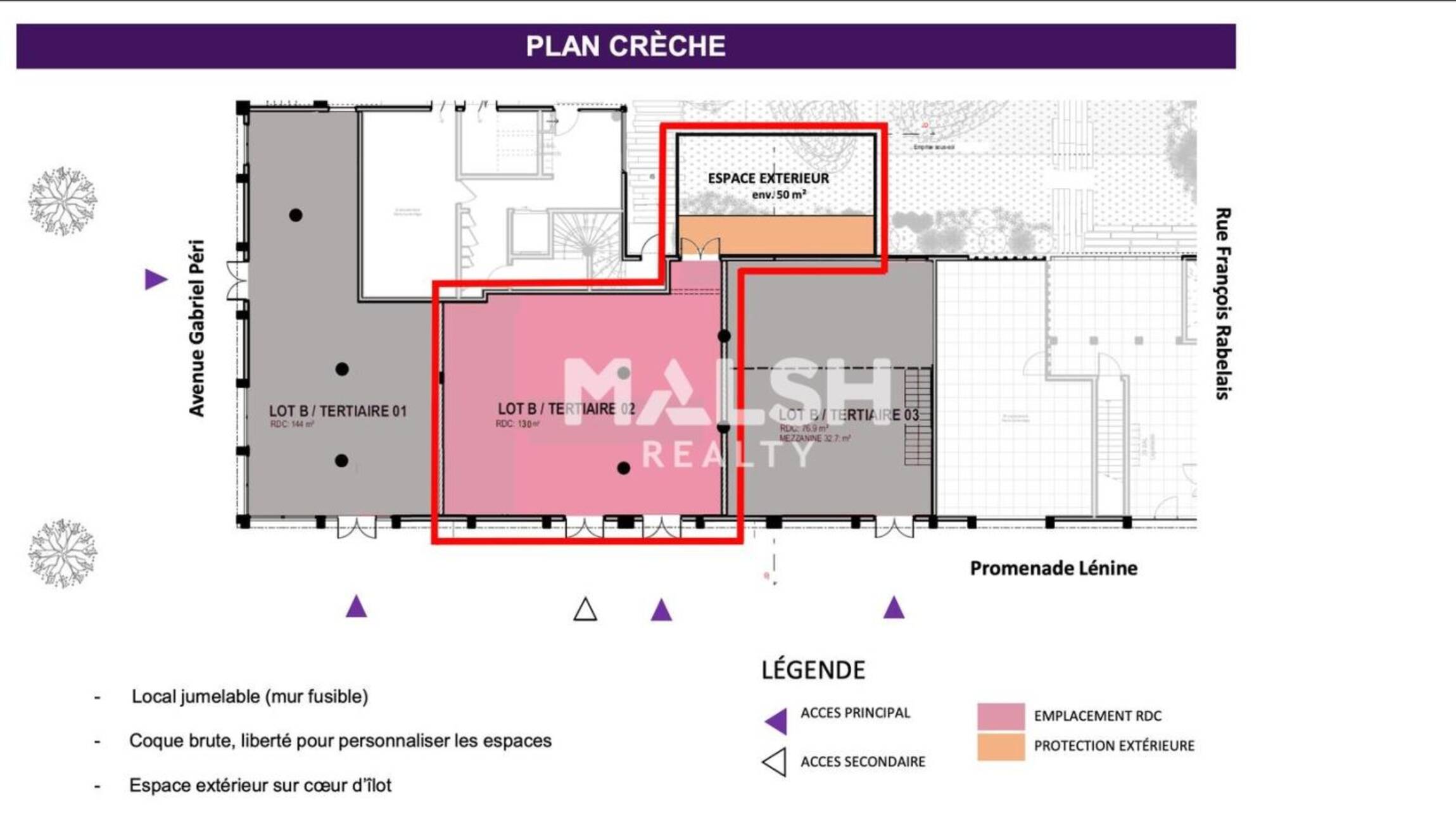 - Lot Tertiaire 02 (Crèche) : Espace extérieur d'environ 50 m² donnant sur îlot vert central