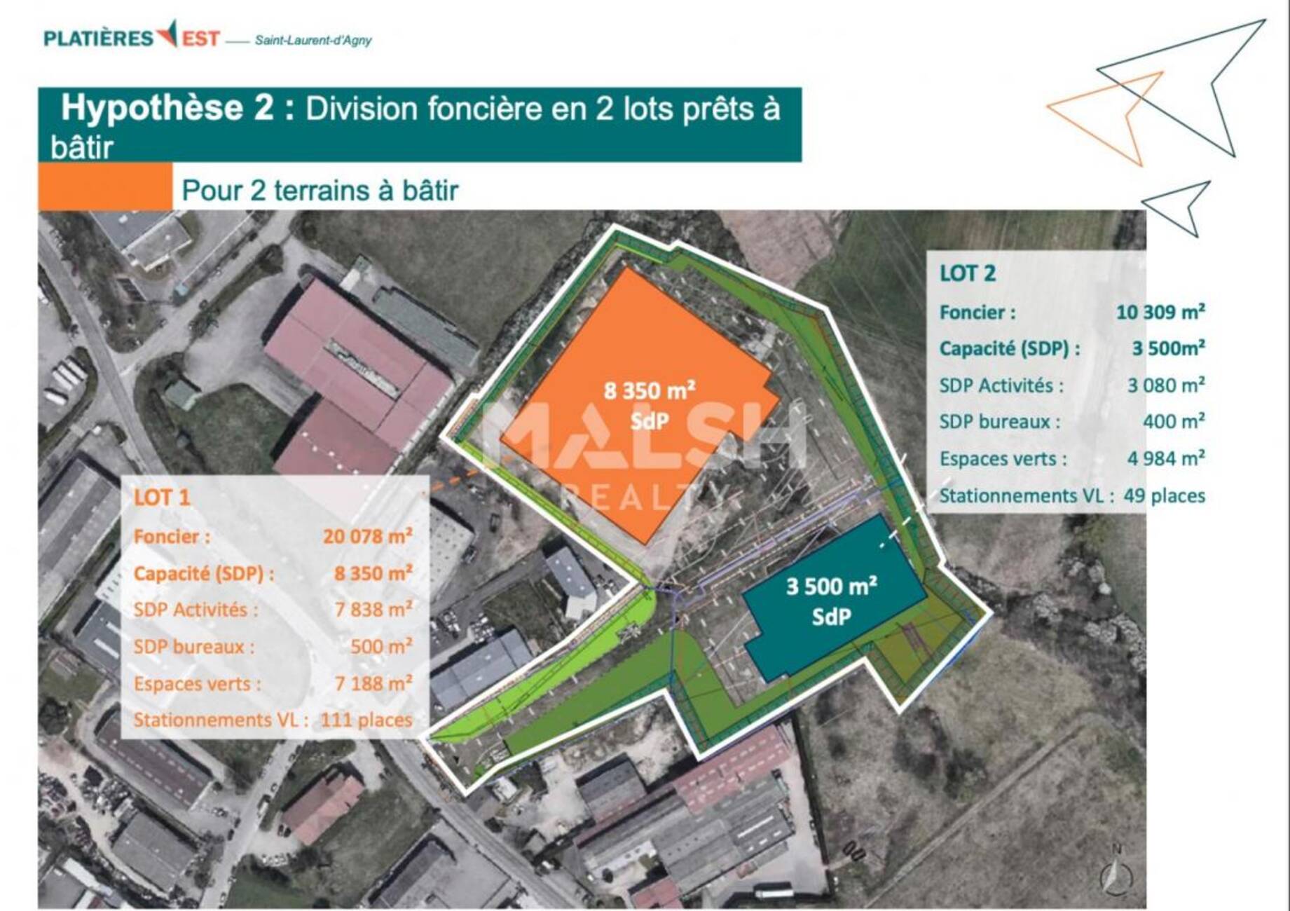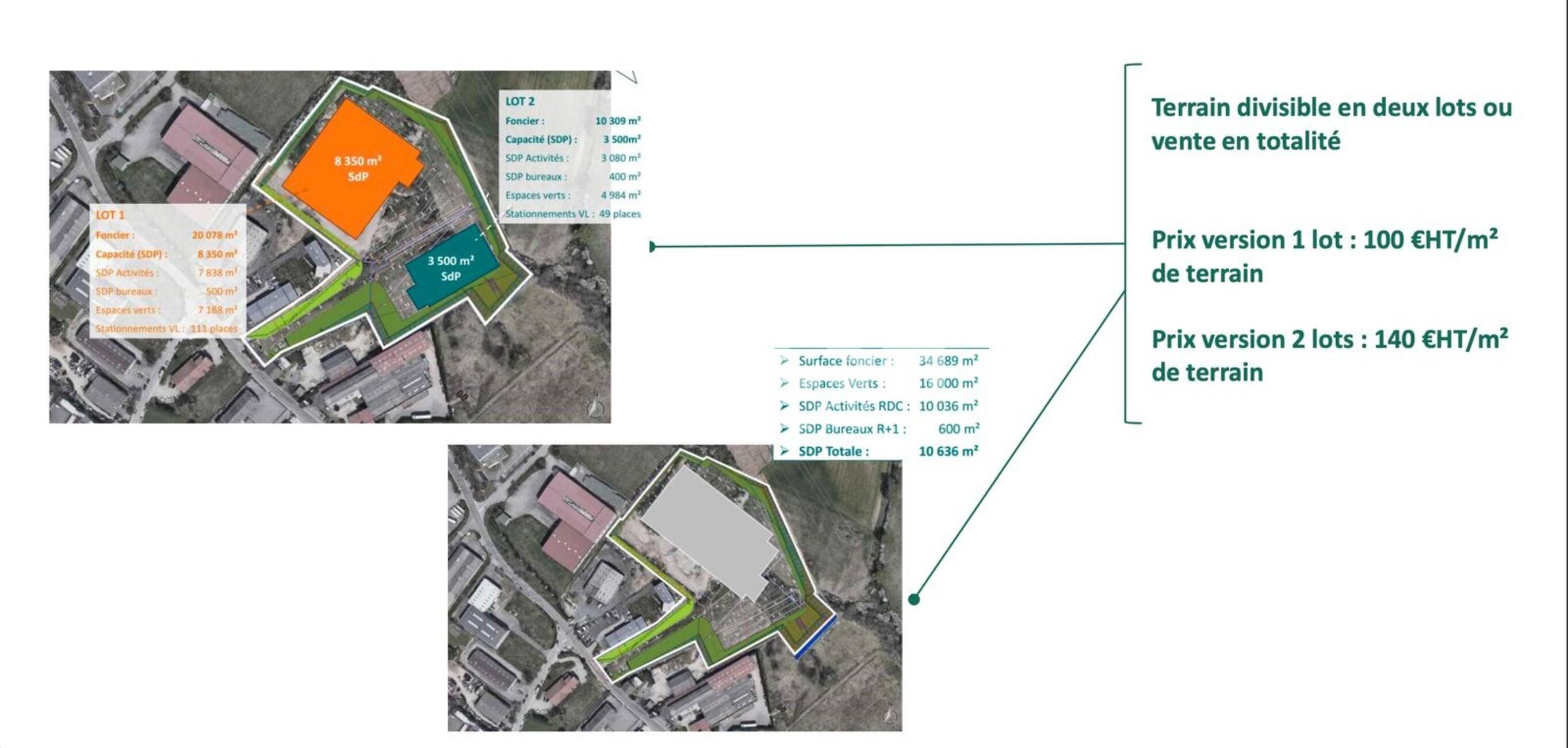 - Lot 2 : 10 309 m² foncier ? SDP 3 500 m² (3 080 m² activité + 400 m² bureaux) - 49 stationnements