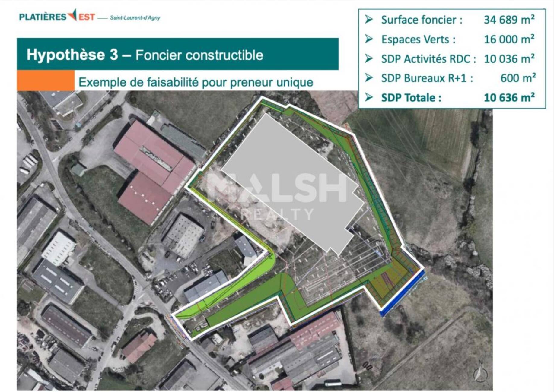 - Exemple de faisabilité : SDP totale 10 636 m² (activité RDC : 10 036 m² + bureaux R+1 : 600 m²)